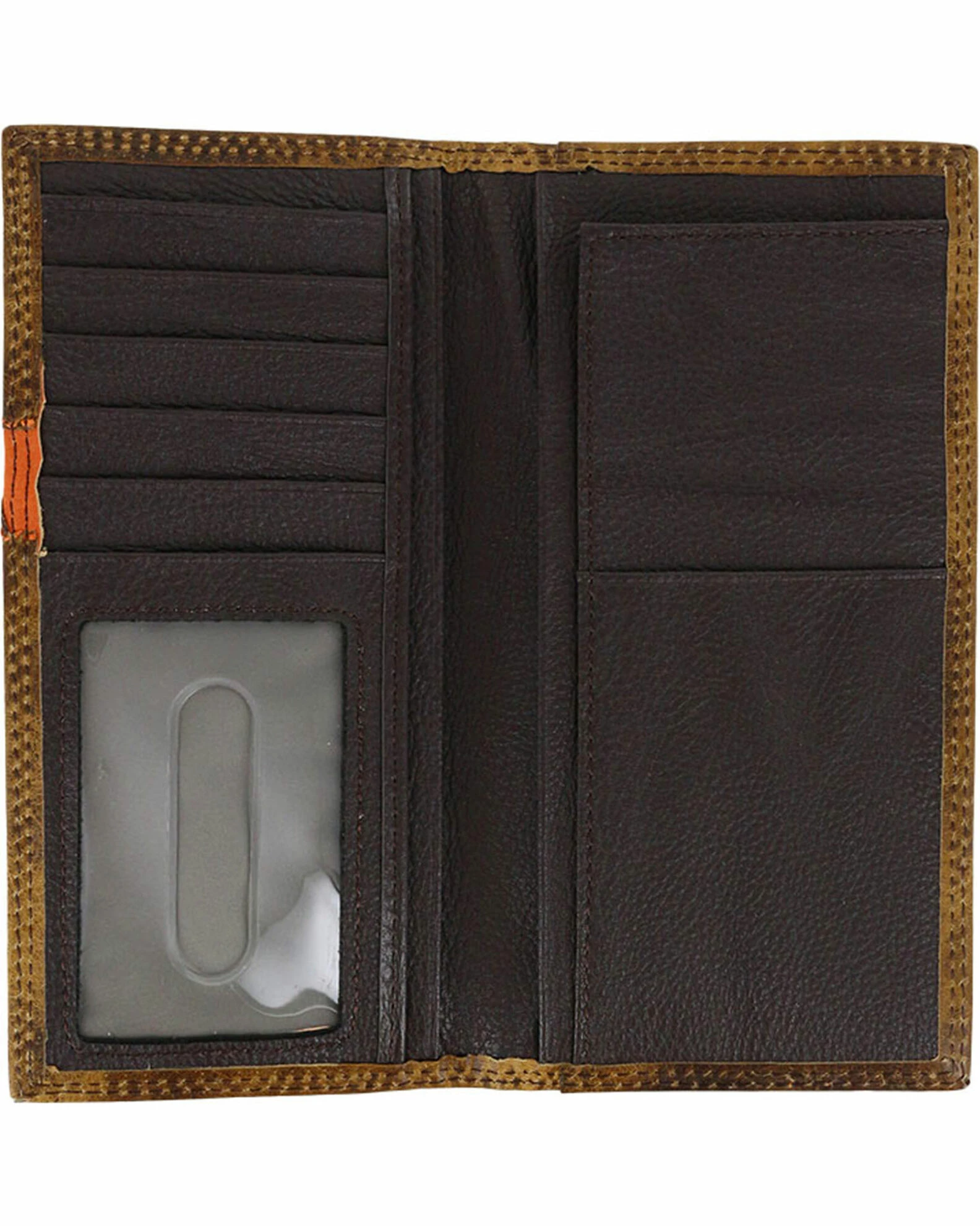 This Western Wallet from HOOey has three open pockets, three credit card slots, a clear view slot for your I.D. and a checkbook holder. It features the HOOey logo in orange on the front. This wallet is a perfect way to carry your I.D., cash, credit cards and checkbook while showing your personality.